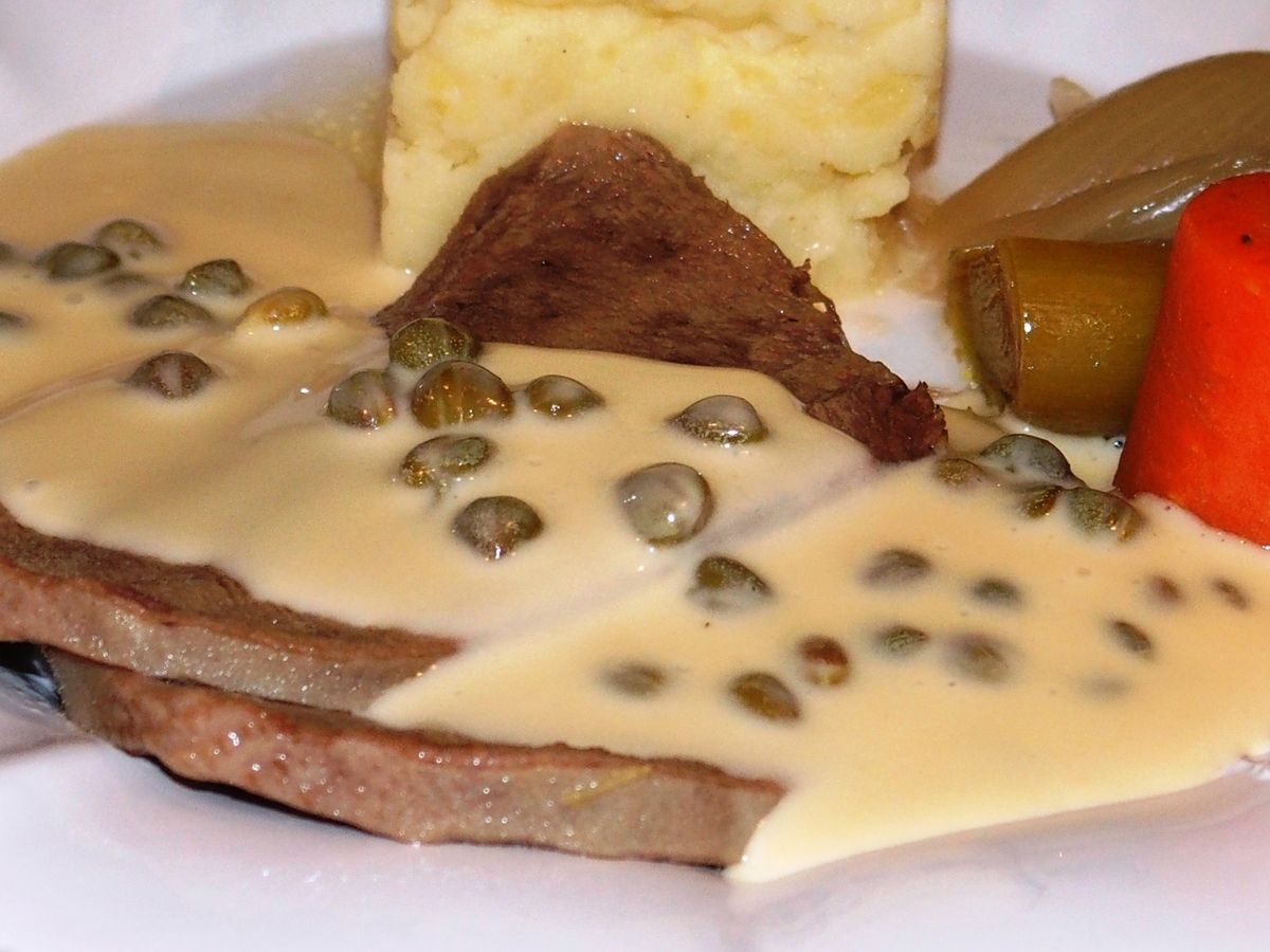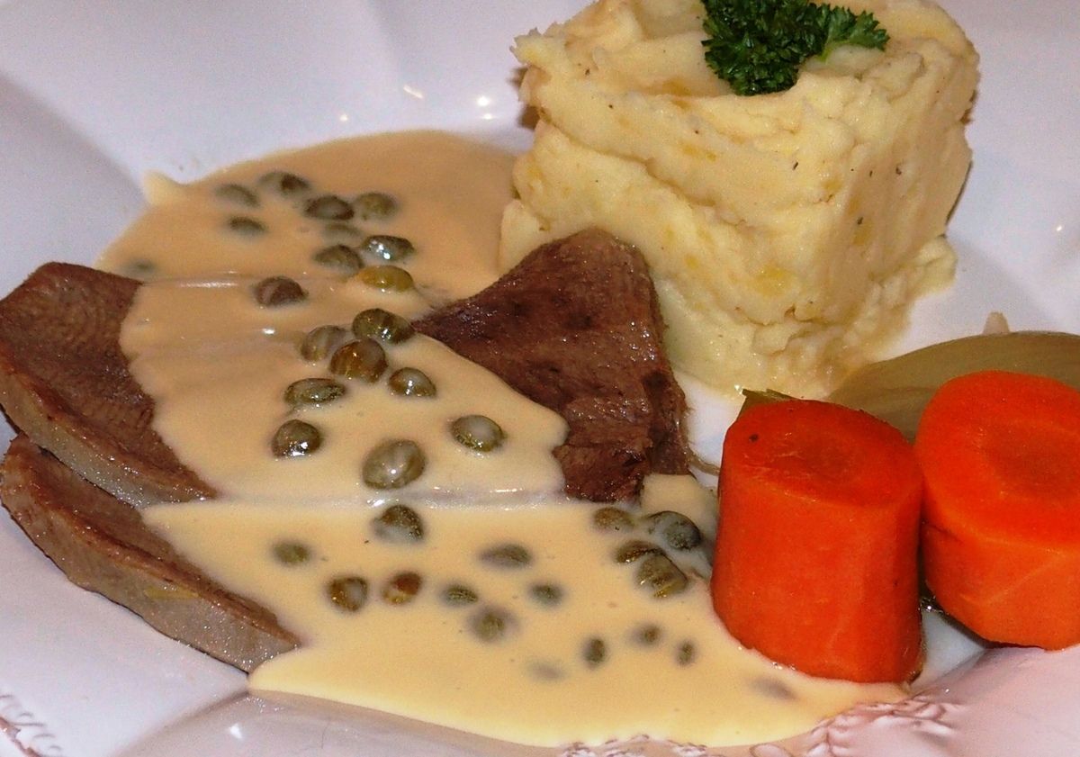 11) Servir les tranches de langue recouvertes de sauce aux câpres et accompagnées de quelques légumes du bouillon.