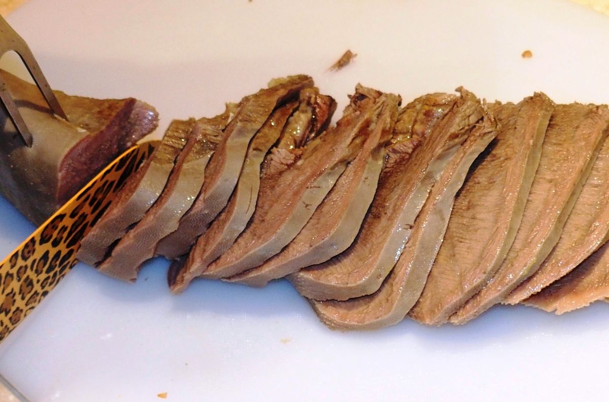 5) Après 3 heures de cuisson, mettre 1 litre de bouillon dans une casserole en le filtrant à travers une petite passoire ou un chinois. Laisser les légumes dans la grande casserole. Sortir la langue, la laisser tiédir et la peler. Enlever à l'aide d'un petit couteau la peau "caoutchouc" ainsi que les bords irréguliers. La couper en tranches d'1/2 cm et remettre dans la grande casserole avec les légumes. Maintenir à couvert sur feu très doux.