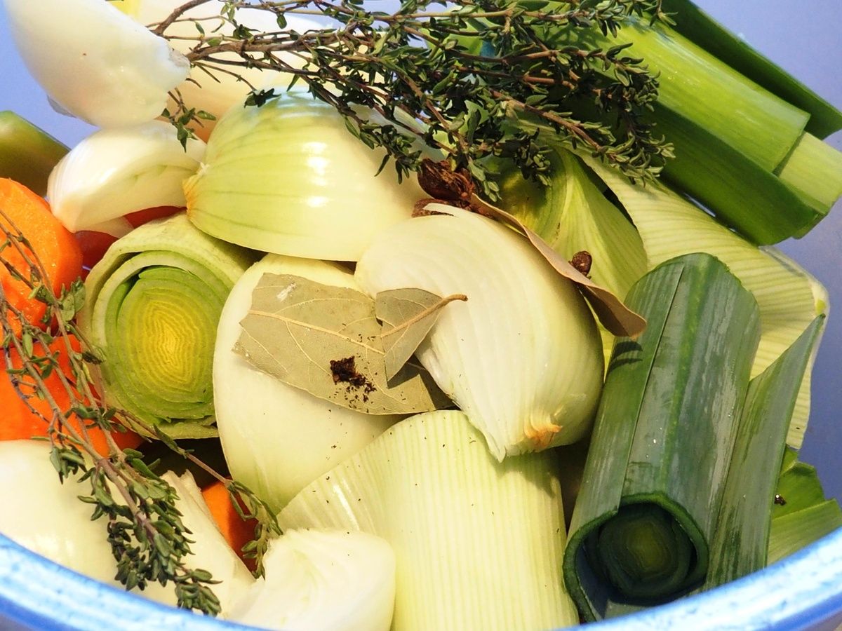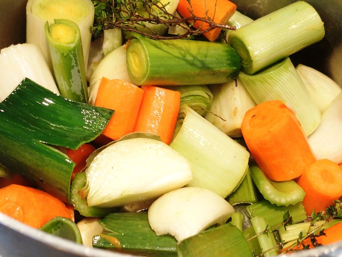2) Préparer la garniture du bouillon: Peler les carottes et les couper en gros morceaux, idem avec les poireaux, les oignons, le céleri branche, les gousses d'ail. Mettre dans un récipient, ajouter les feuilles de laurier, la badiane, les clous de girofle (plantés dans un gros bout d'oignon), les grains de poivre noir et les branches de thym.