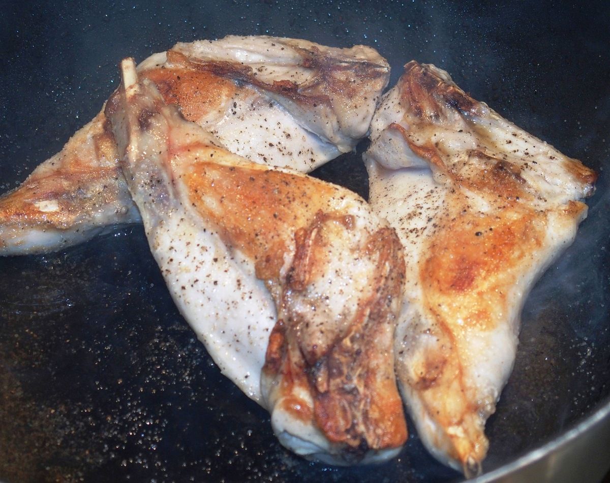 1) Dans un faitout (ou grande casserole), faire chauffer 3 càs d'huile à rôtir et rissoler le lapin par portion jusqu'à ce qu'il soit bien doré. Assaisonner à chaque portion de sel et de poivre et entre chaque portion, retirer le gras à l'aide d'un papier ménage. Réserver dans un récipient.