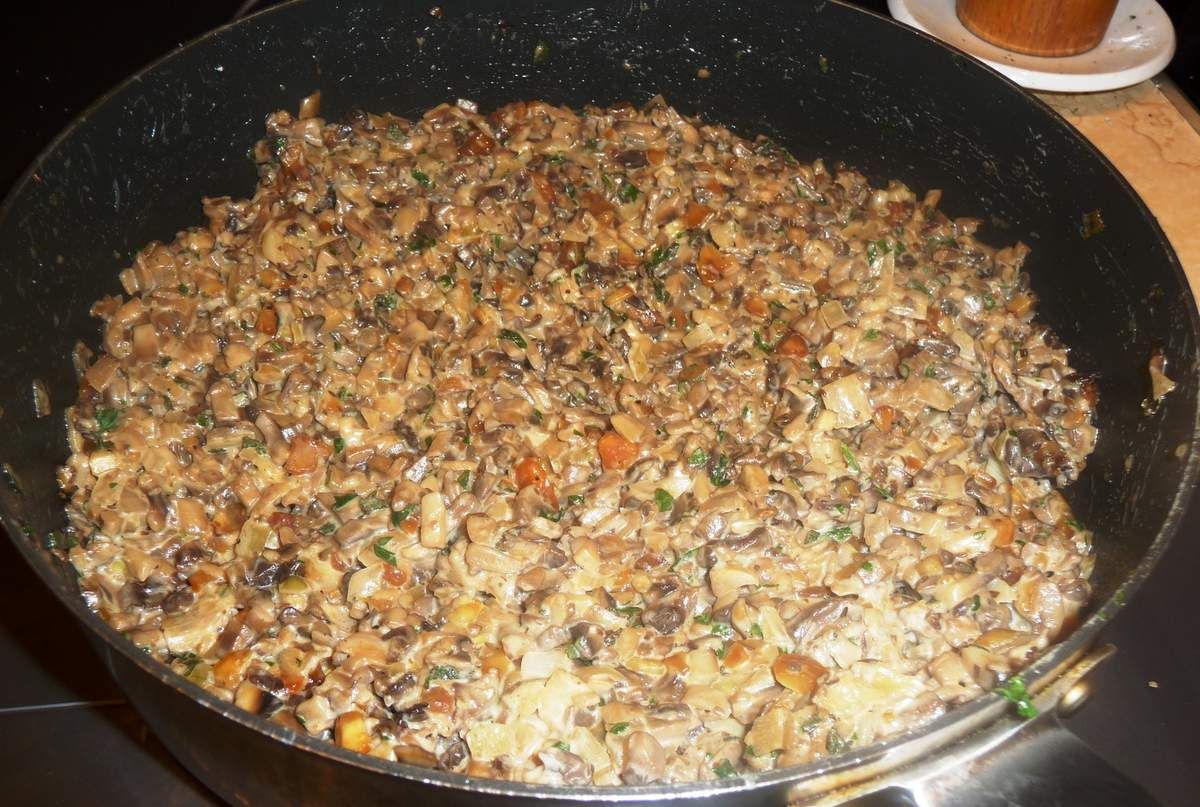 6) Farcir l'intérieur avec la duxelles (attention à ne pas en mettre trop, sinon vous ne pourrez plus les refermer convenablement). Laisser le reste de la duxelles dans la poêle pour la sauce.