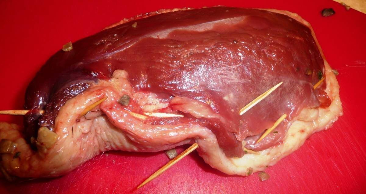 7) Refermer les magrets avec des cure-dent. Essayez, comme vous l'avez sûrement appris en couture à l'époque, de piquer contre le bas et remonter contre le haut. Mais faites comme vous pouvez. Utiliser autant de cure-dent que nécessaire, on s'en fiche après on les enlève...:-)
