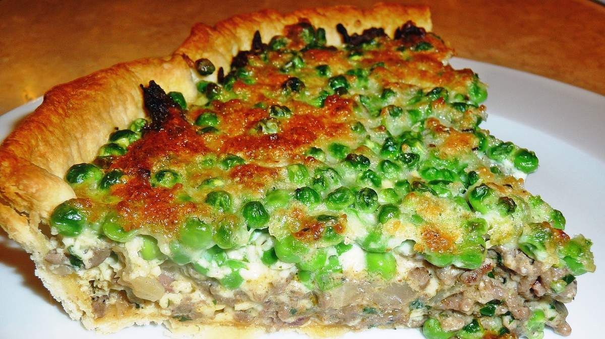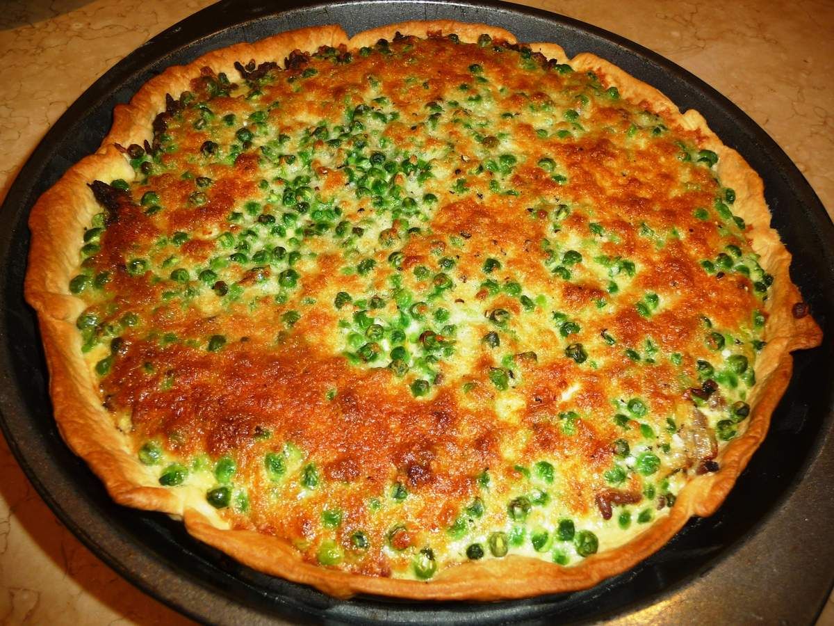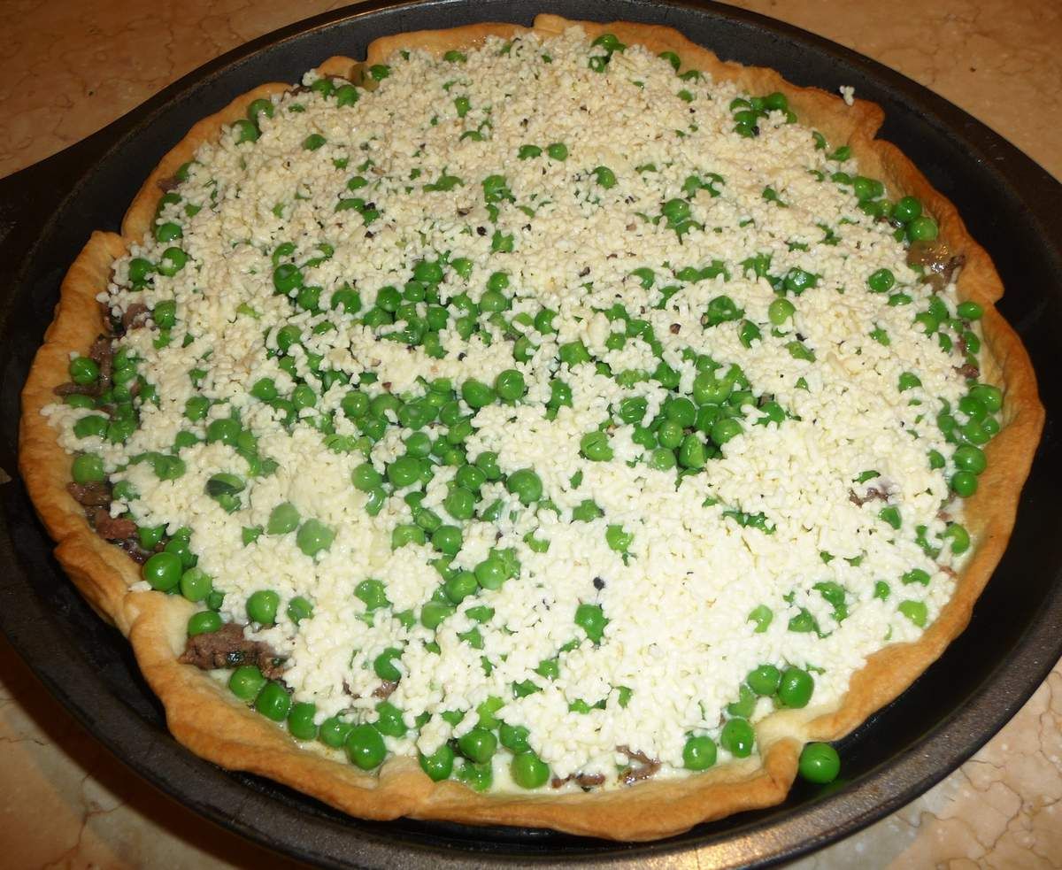 6) Dans le moule à tarte, mettre la viande, puis les petits pois tiédis et verser la liaison (le gruyère reste à la surface, c'est normal). Attention à mettre la liaison juste avant d'enfourner si vous préparez cette quiche à l'avance!
