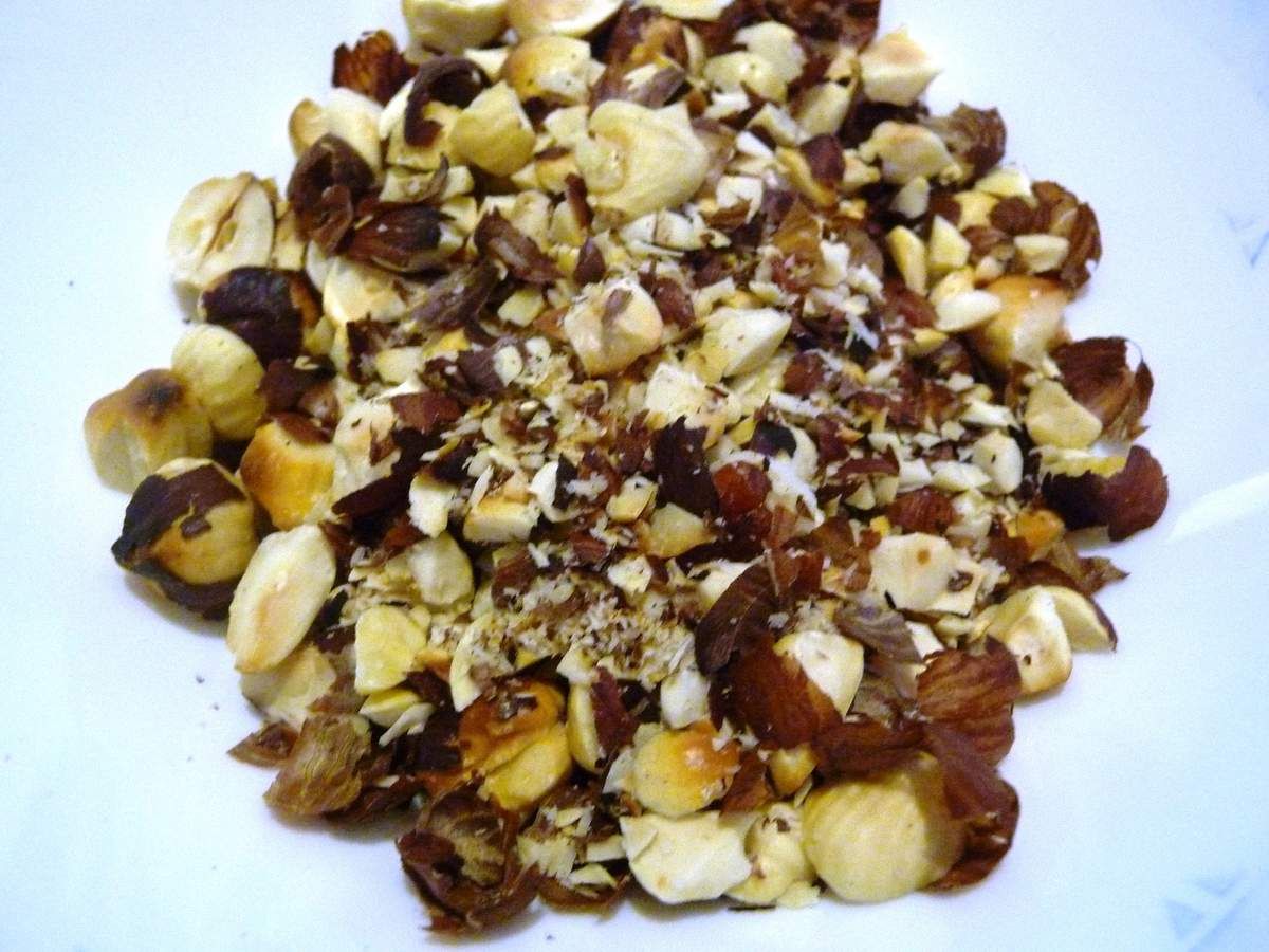 1) Mettre les noisettes sous le grill du four à 200°C pendant 2 minutes pour les torréfier. Sur une planche, les concasser grossièrement avec un couteau.