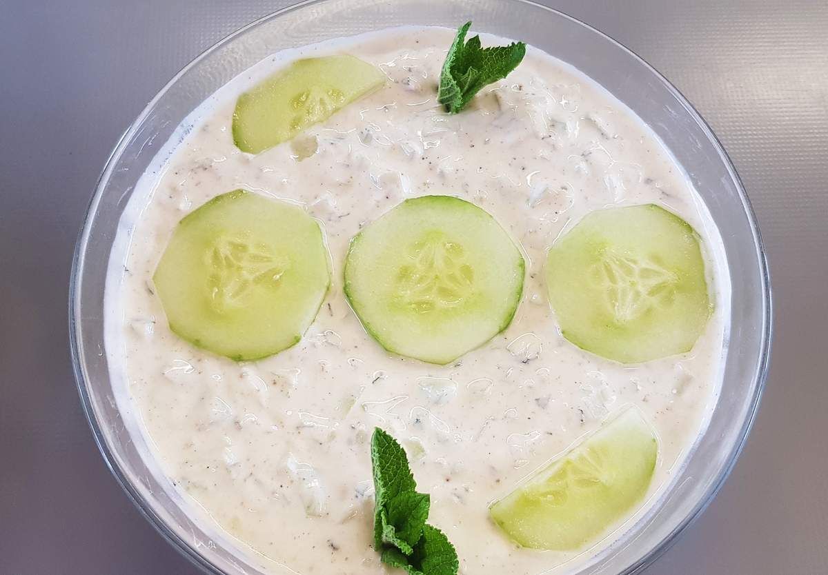 2) Dans un grand bol ou un plat creux, mettre les yaourts, le concombre, la gousse d'ail pelée et passée à travers un presse-ail, la menthe, le cumin. Ajouter un filet d'huile d'olive, saler et poivrer. Goûter et rectifier l'assaisonnement. Garder au frais.