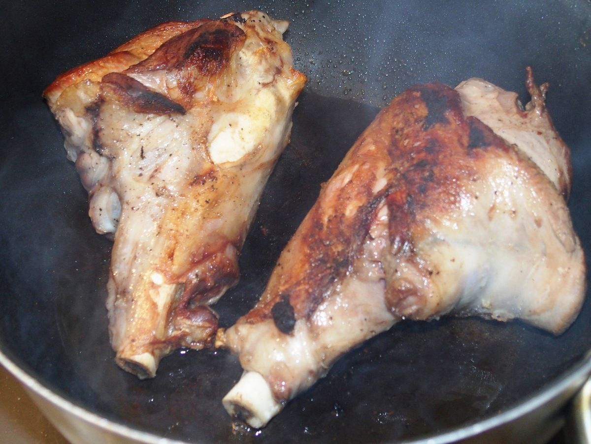 1) Dégraisser un peu les souris avec un couteau fin si nécessaire.Poivrer et saler de toutes parts les souris. Dans une grande cocotte allant au four, faire chauffer un gros filet d'huile d'olive et le beurre sur la plaque. Faire dorer uniformément les souris durant une dizaine de minutes en les retournant régulièrement sur feu moyen-fort.