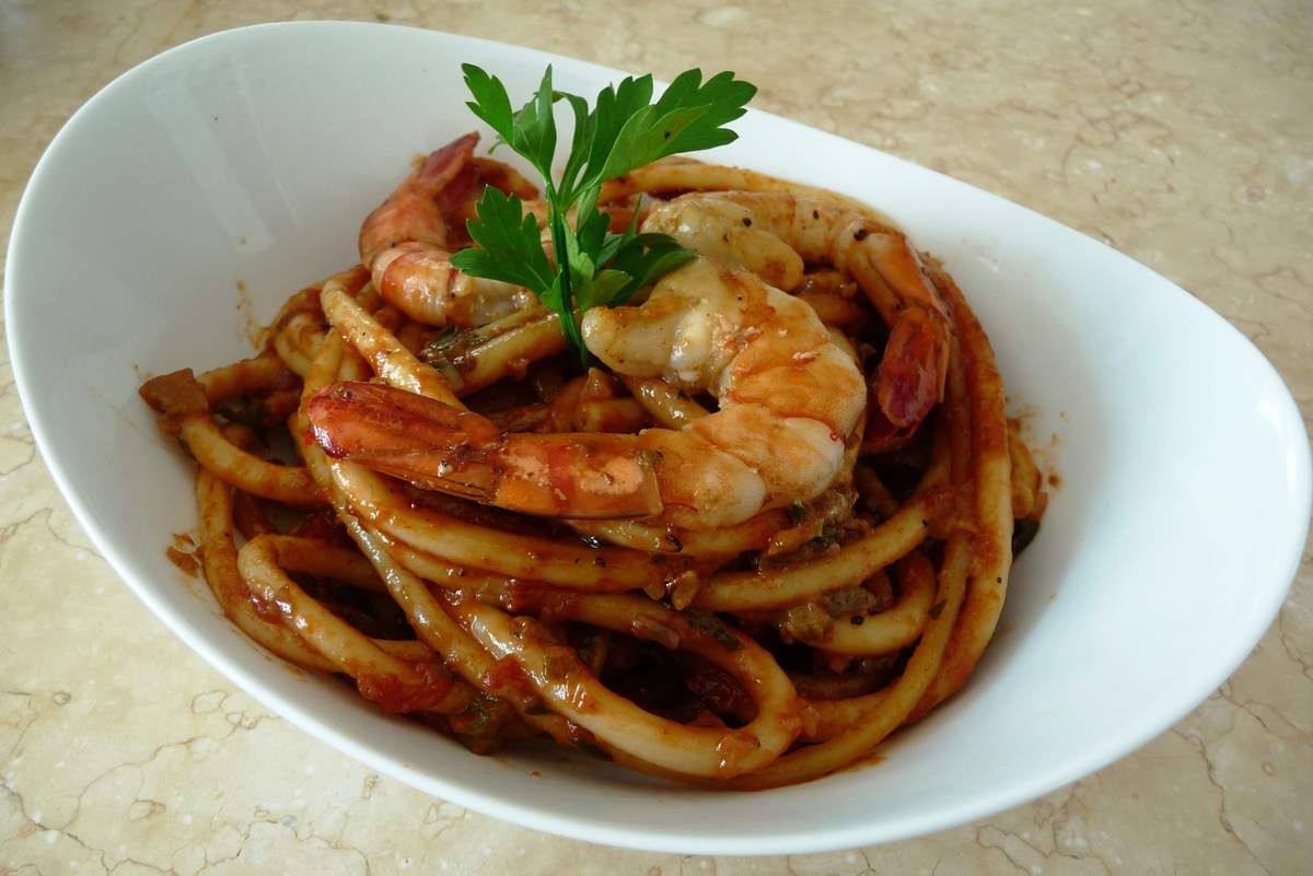 8) Mélanger les pâtes avec la sauce, mettre dans une assiette creuse et poser quelques crevettes sur les pâtes. Parsemer d'un peu de persil!