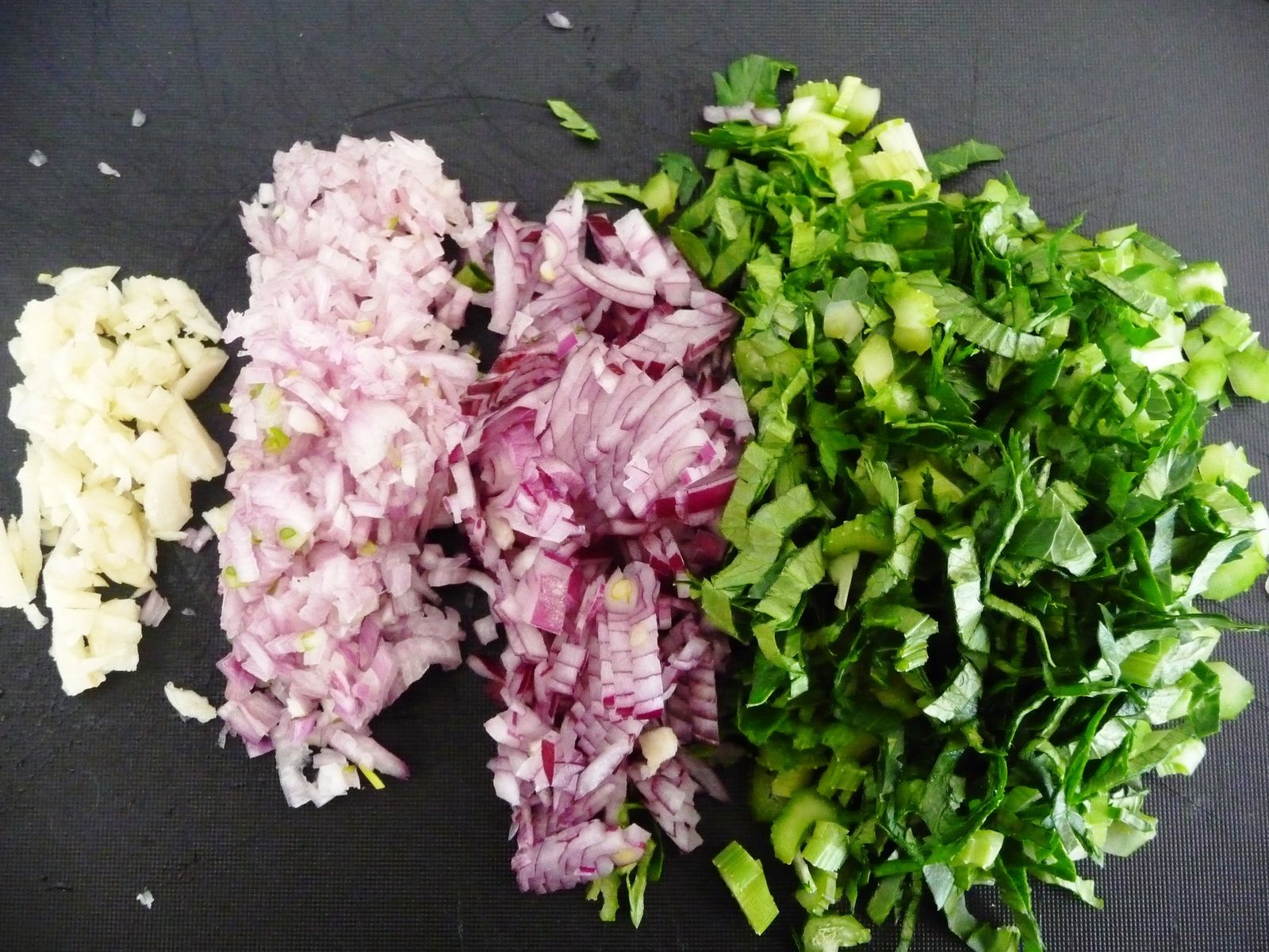 1) Couper finement le céleri, l'échalote, l'oignon rouge et 2 gousses d'ail