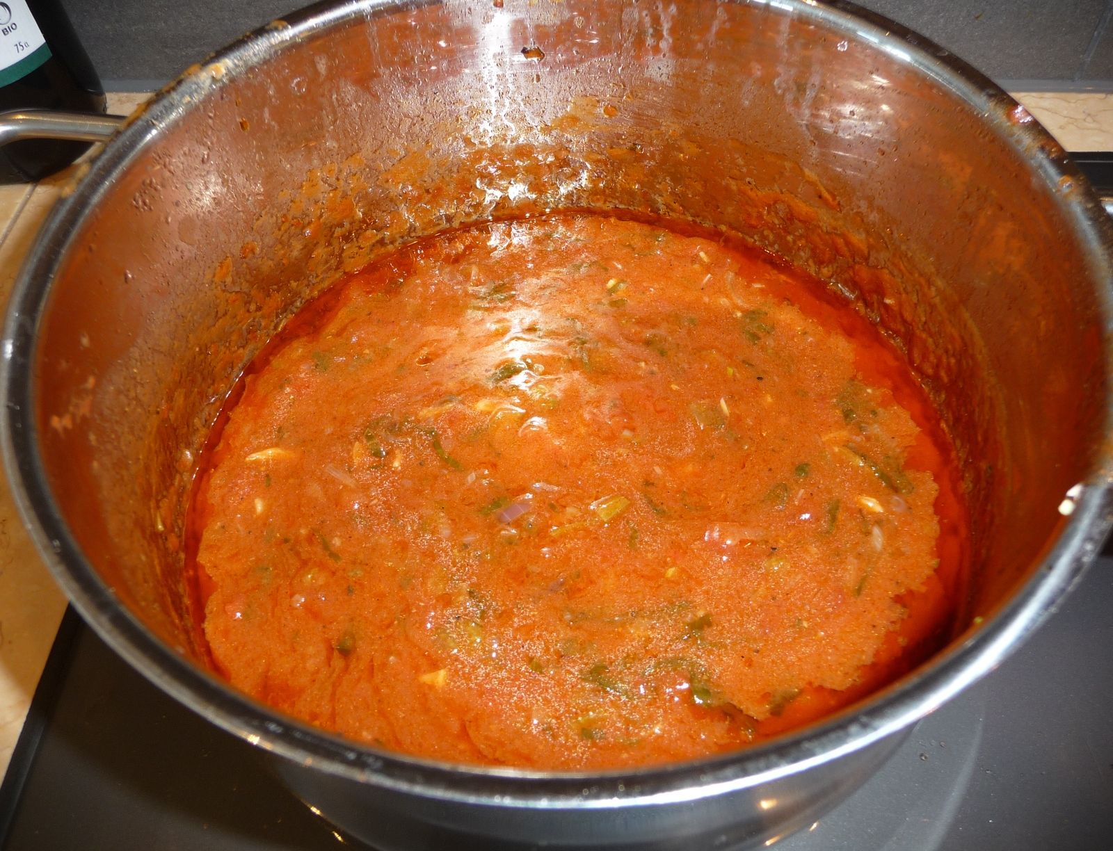5) Ajouter les tomates concassées. Saler et poivrer. Laisser cuire à feu très doux à découvert durant environ 45 minutes en mélangeant de temps en temps. A mi-cuisson, ajouter 2 càs d'huile d'olive dans la casserole.