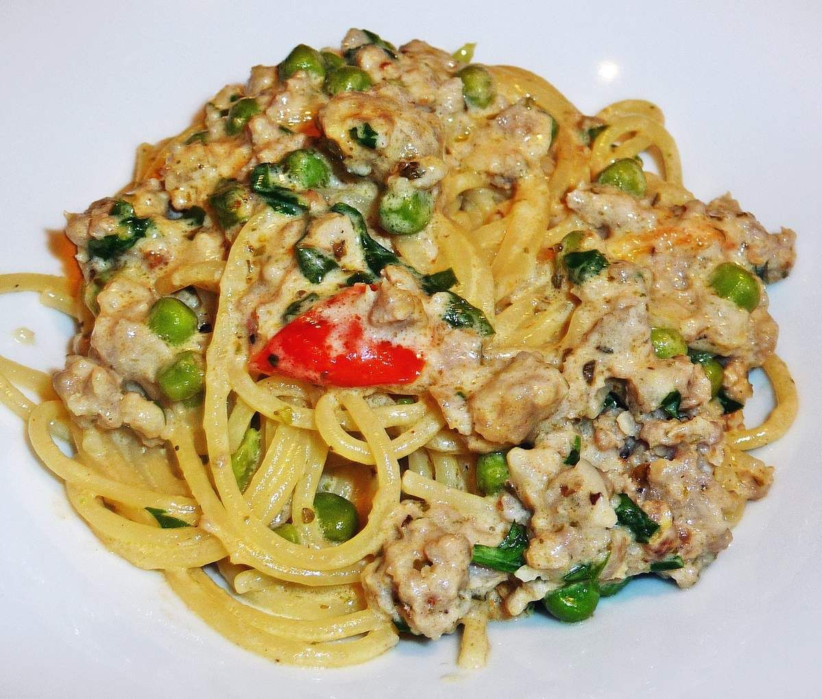 Voilà une délicieuse recette de pâtes improvisée. Vous savez encore une fois combien j'aime la saucisse (si vous aussi vous l'aimez, allez voir ma Saucisse à rôtir, sauce aux oignons). Je l'aime entière mais aussi déstructurée. Il paraît que c'est la mode en ce moment de "déstructurer" un produit :-) Et pour le coup, c'est chose faite!
