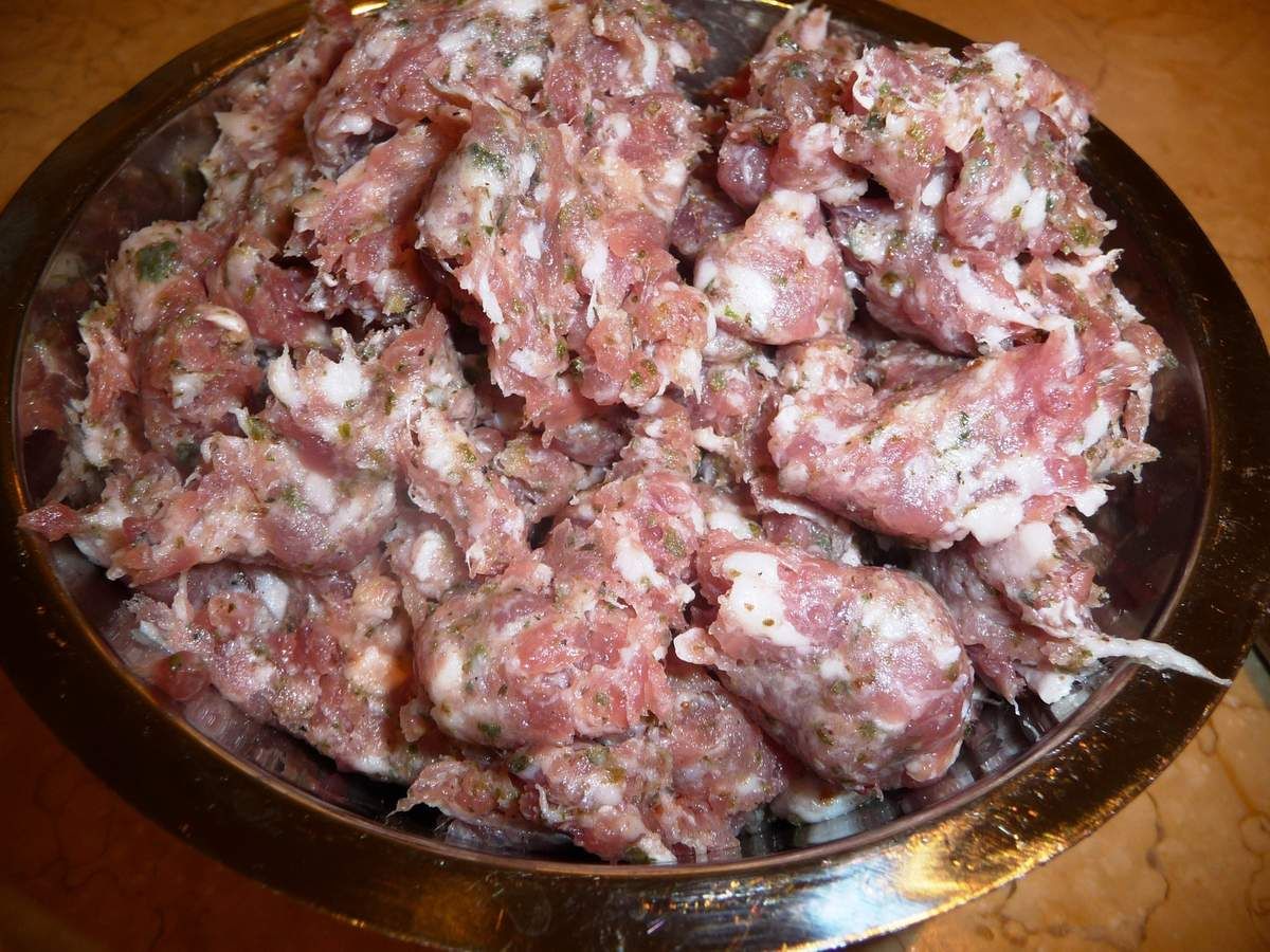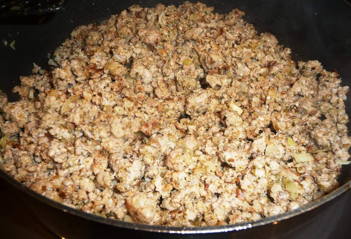 1) Déstructurer la saucisse, entailler la peau et la retirer. Extraire la chair en pressant de haut en bas. Faire de petits morceaux.