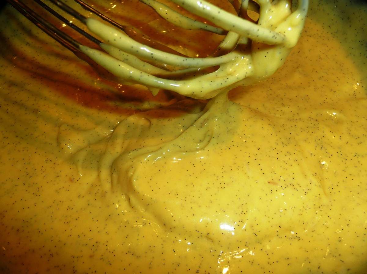 2) Couper en deux la gousse de vanille et retirer les graines à l'aide d'un petit couteau. Dans une petite casserole, mettre le reste du lait, la gousse de vanille et ses graines et le sucre à chauffer à frémissements (ne pas bouillir) en fouettant. Verser le mélange avec les oeufs et sur feu moyen, fouetter sans cesse jusqu'à ce que la crème soit homogène et épaisse. Retirer la gousse de vaille. Sortir du feu. Ajouter les 25g de beurre en petits morceaux.. Fouetter vivement, mettre dans un bol et laisser refroidir.