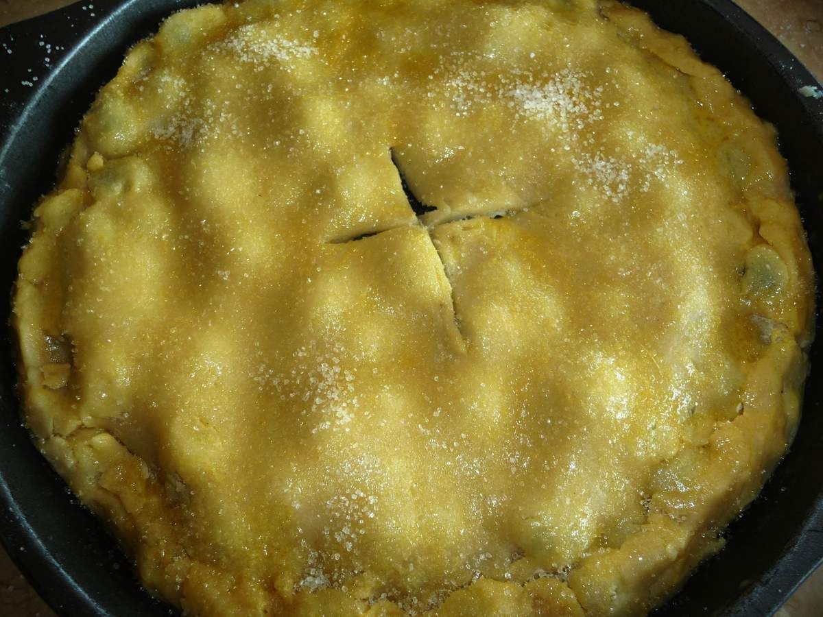 5) Sortir la deuxième moitié de pâte du réfrigérateur. L'abaisser du diamètre de votre plat à tarte. Recouvrir la préparation aux myrtilles avec le disque de pâte en fronçant avec vos doigts les bords des deux pâtes afin que le tout adhère bien. Faire une incision au centre en forme de croix pour que la vapeur puisse s'échapper durant la cuisson. Appuyer un peu la pâte sur le mélange aux myrtilles pour qu'elle y adhère bien. Mélanger le jaune d'oeuf et le lait et badigeonner la pâte avec un pinceau et saupoudrer de sucre de canne.