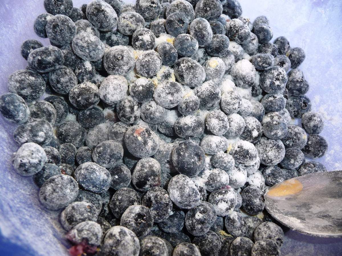 1) Dans un récipient, mélanger les 100g de sucre, la farine et le sucre vanillé. Incorporer les myrtilles, râper le zeste de citron et ajouter. Mélanger le tout avec une cuillère. Réserver au frais.