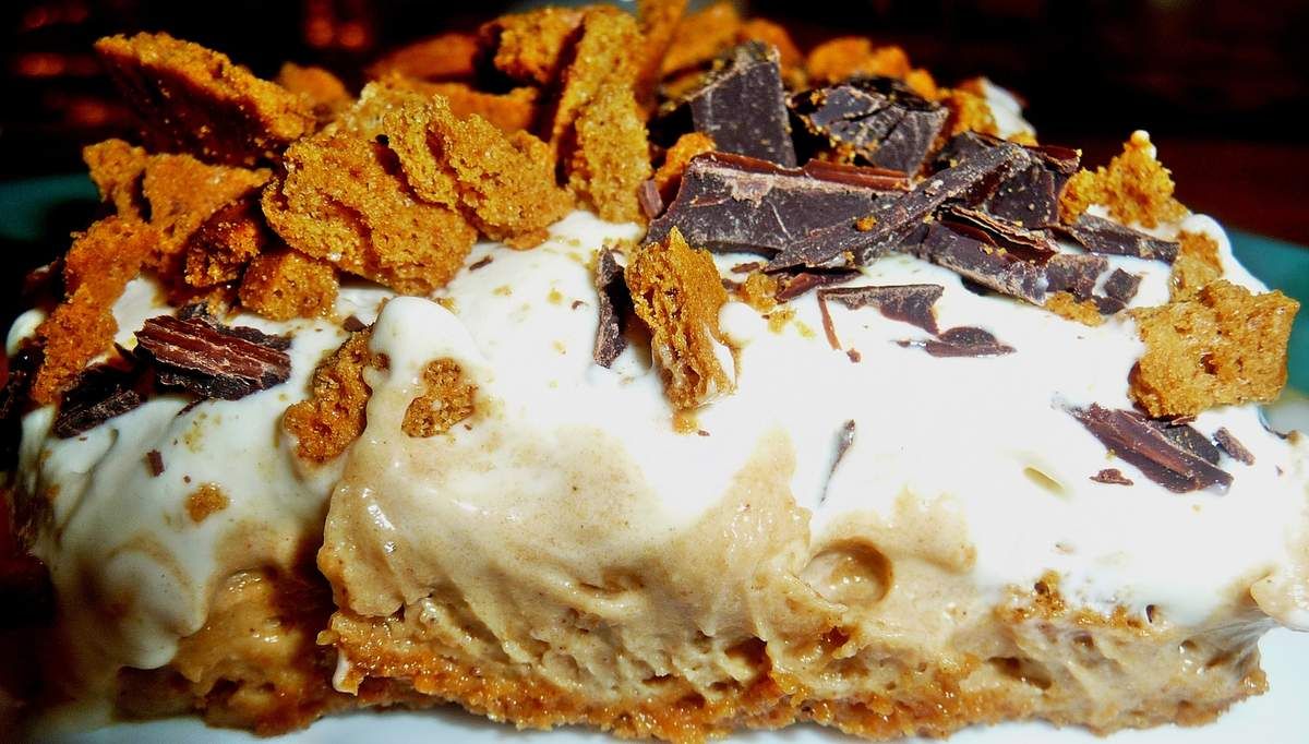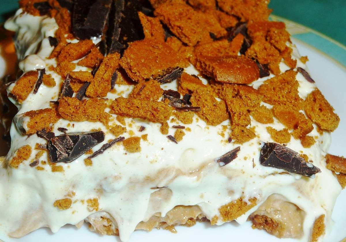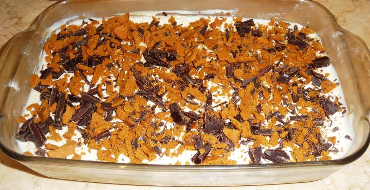 9) Couper le chocolat en fines lamelles à l'aide d'un couteau et concasser quelques spéculoos. Mélanger et parsemer le tiramisu avant de servir.