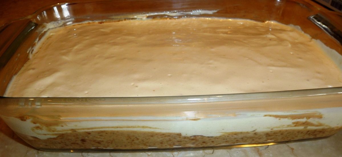 7) Dans le plat, mettre d'abord le mélange aux spéculoos, lisser avec une spatule. Ajouter ensuite le deuxième mélange "nature" et lisser également: