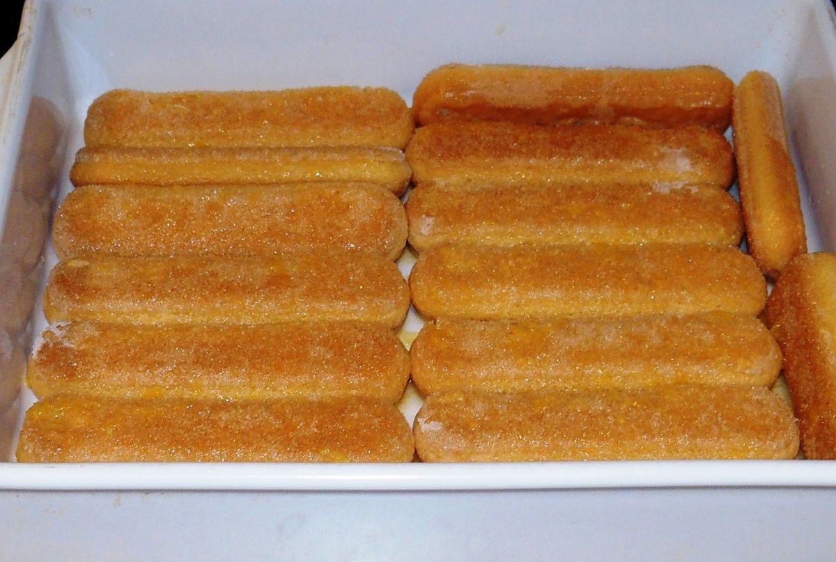 3) Dans le fond du plat, déposer une couche de biscuits à la cuillère. Presser le jus de l'orange, ajouter le jus de citron et le limoncello. Mélanger et verser doucement sur les biscuits afin qu'ils soient bien imbibés (mais pas noyés hein?).