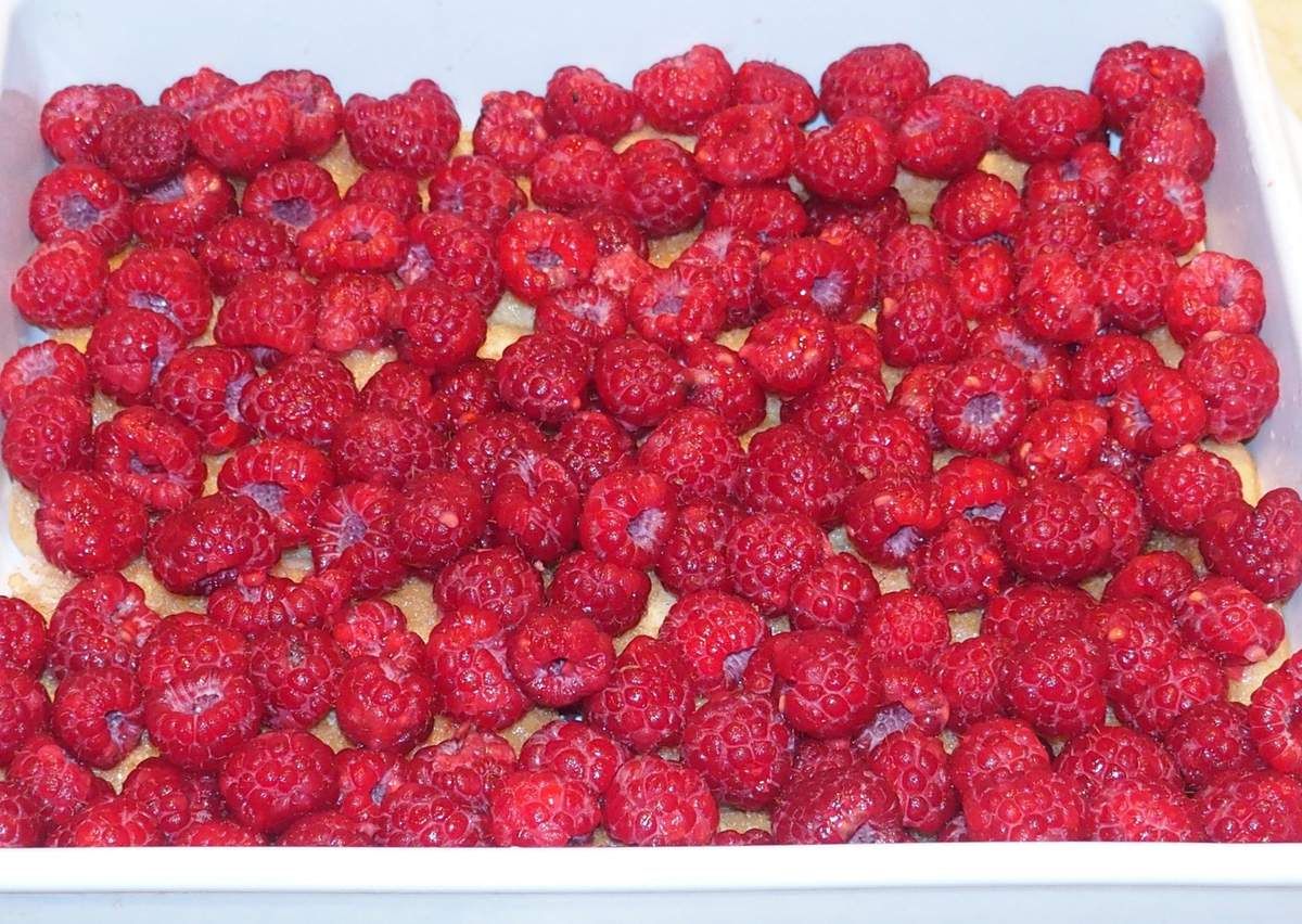 4) Disposer les framboises par dessus les biscuits. En mettre de côté quelques unes pour la déco au service.