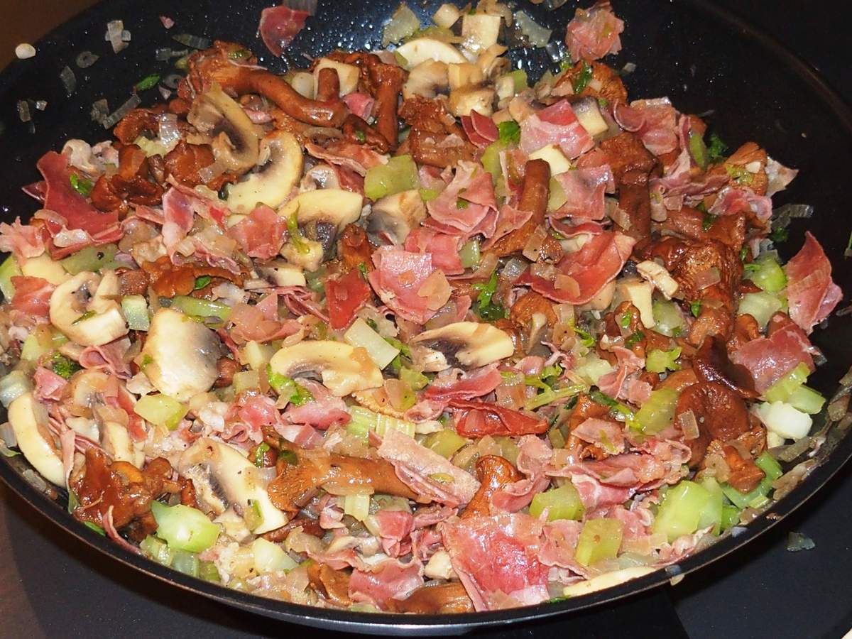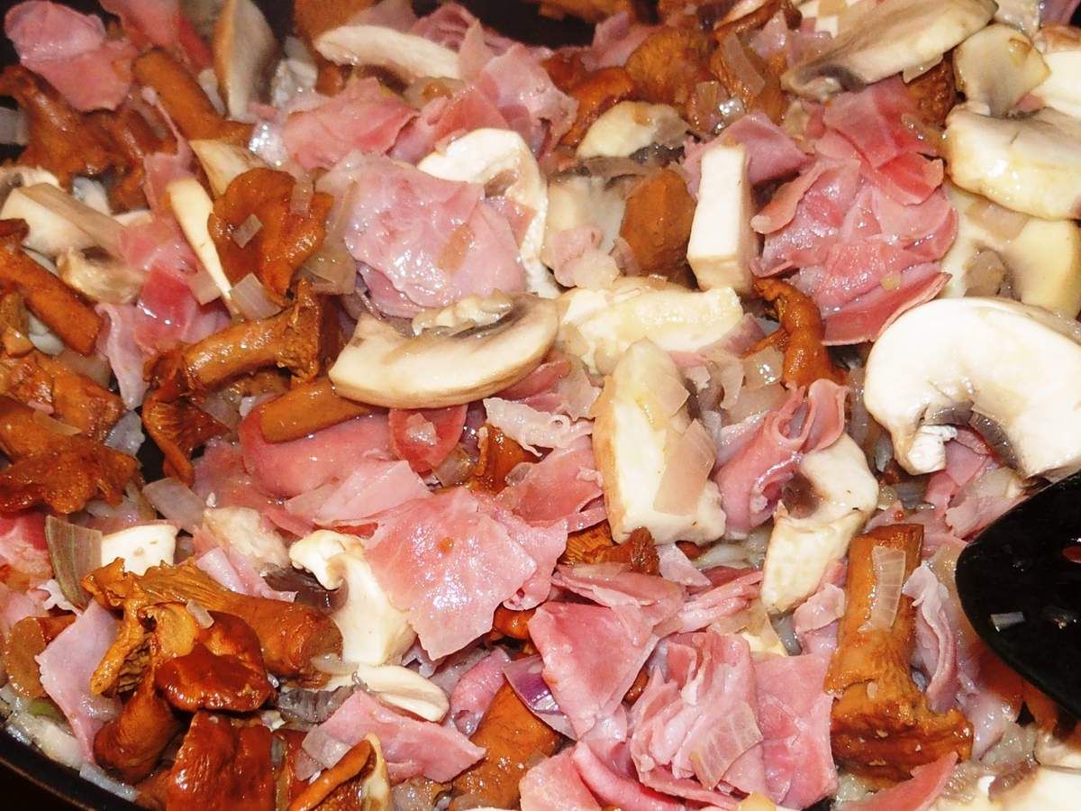 5) Dans une grande poêle à haut rebord, faire chauffer l'huile d'olive et ajouter le jambon, les échalotes et les champignons. Cuire environ 5 minutes à feu élevé jusqu'à ce que les champignons aient rendu toute leur eau.