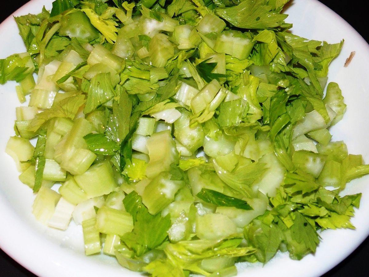 4) Passer sous l'eau les 2 branches de céleri. Couper en tout petits dés et réserver dans un bol.
