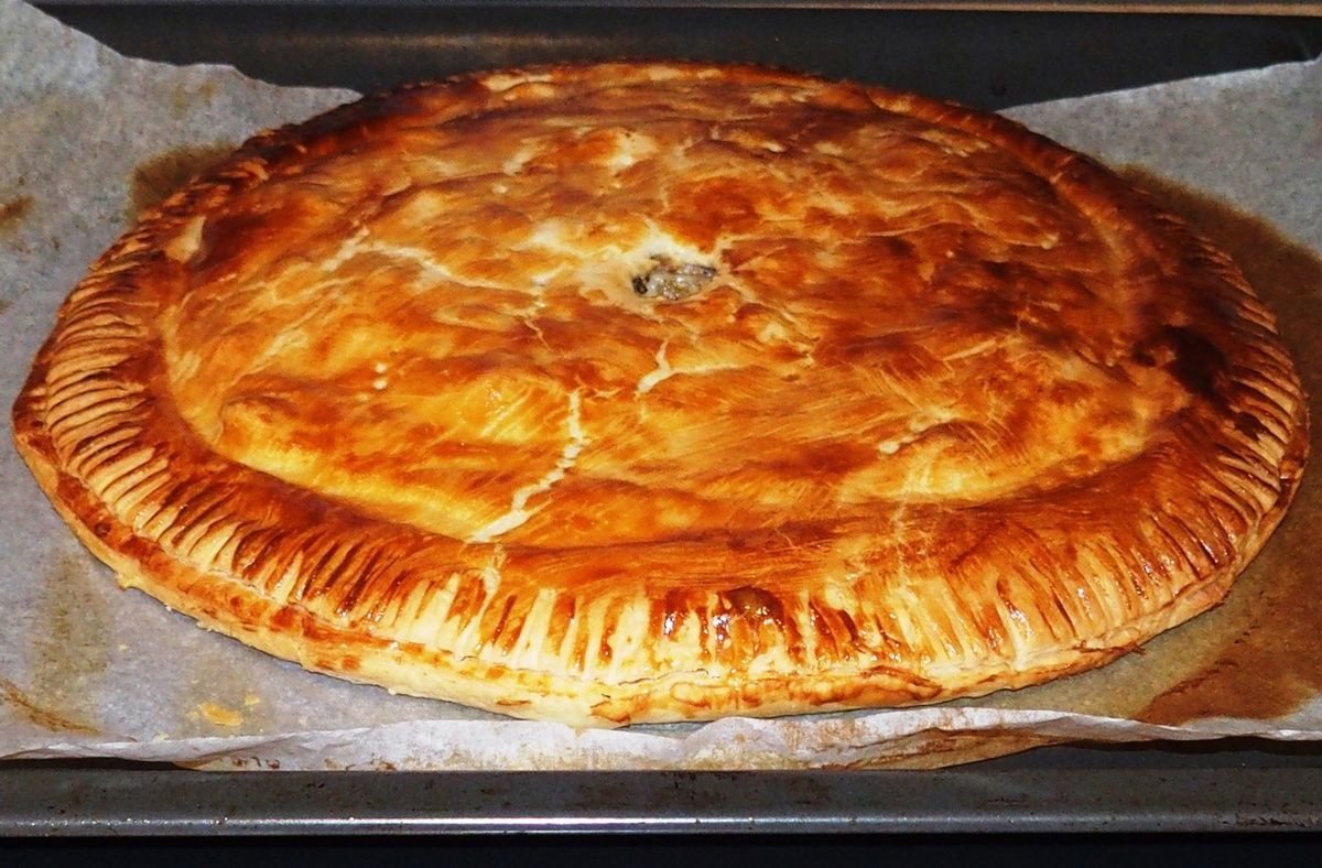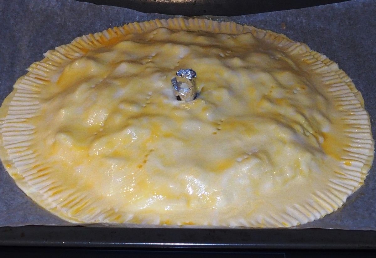 10) Recouvrir de la deuxième abaisse de pâte et sceller le bord en pressant avec les doigts puis avec une fourchette sur tout le tour. Piquer un peu de part et d'autres avec la fourchette et faire une incision au centre avec un couteau pour que l'humidité s'évapore en cours de cuisson. Vous pouvez confectionner une cheminée en roulant une petite bande d'aluminium autour de l'auriculaire et en la plantant dans l'orifice. Badigeonner l'ensemble de jaune d'oeuf.